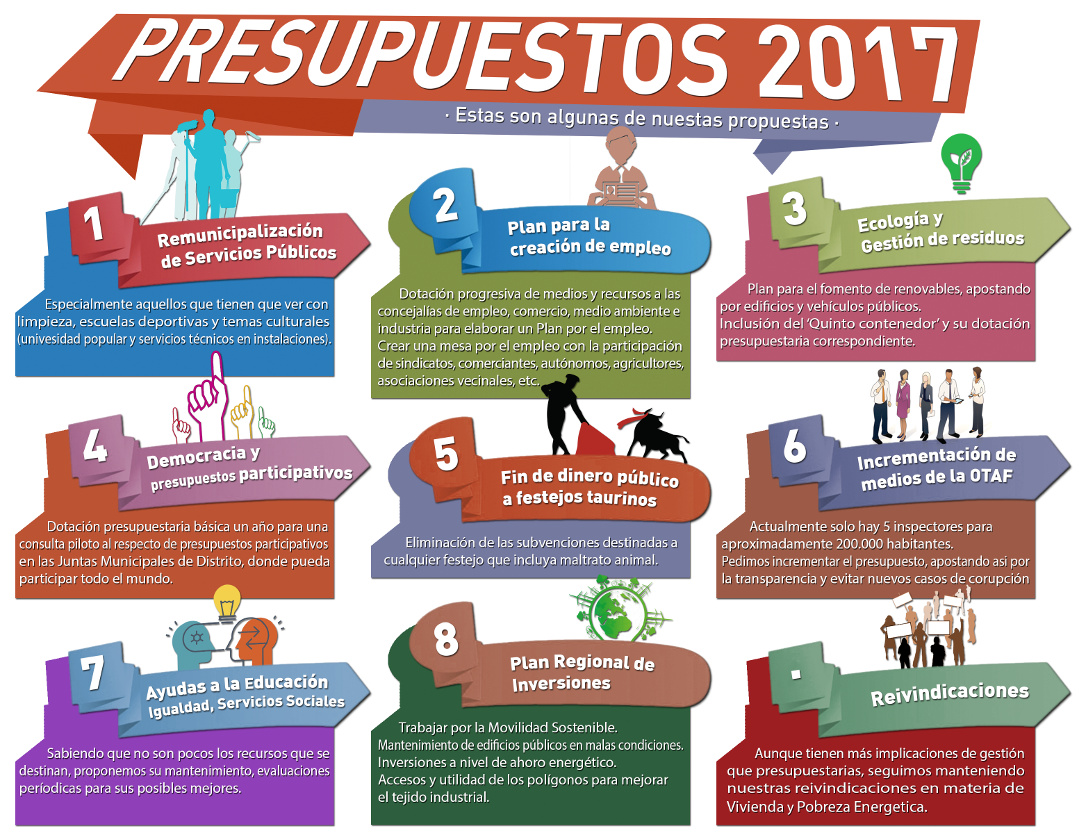 Pues bien, nosotras hemos realizado, públicamente y también directamente, una batería de propuestas que consideramos que junto a otras muchas contribuirían a dar un vuelco a la situación de esta ciudad, propuestas que iban desde la creación y puesta en marcha de un plan estratégico de empleo hasta la defensa plena de todos y cada uno de los servicios públicos que forman parte del patrimonio de todas, el trabajo por la recuperación de los servicios externalizados o privatizados, la dinamización comercial, industrial y agrícola, proyectos novedosos en materia de medio ambiente y sostenibilidad o la eliminación de gastos que consideramos innecesario realizar con dinero público como los destinados a festejos taurinos.