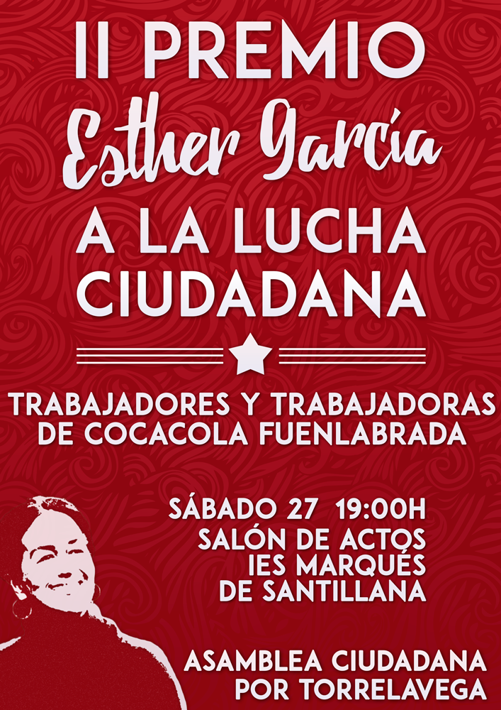 Aprovechamos este comunicado para expresar nuestras felicitaciones a las trabajadoras y trabajadores de Coca-Cola por su ejemplo de lucha en defensa de los derechos de las/os trabajadoras/es y por obtener este año el premio Esther García a la lucha ciudadana que otorga la Asamblea Ciudadana por Torrelavega.