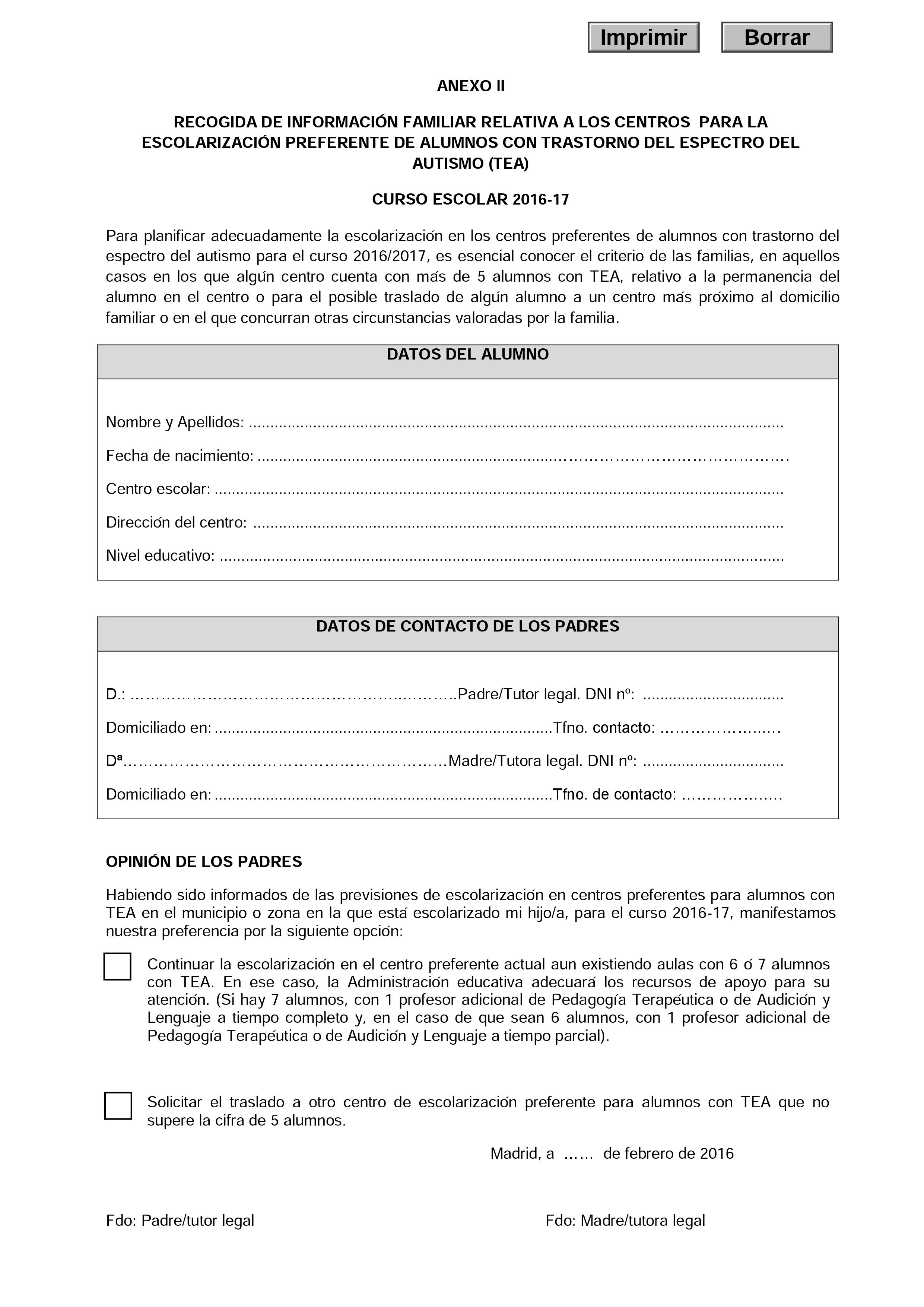 Las familias madrileñas de niños y niñas con TEA se han encontrado nuevamente con la agresión del gobierno del partido popular en materia educativa, lejos de asegurar el ratio establecido de 5 alumnos/as con TEA por aula, ahora desde la Dirección General de Educación de la Comunidad de Madrid lanzan el ANEXO II, donde obligan a elegir entre continuar en el centro(a pesar de que pueda haber más de 5 por aula TEA) o solicitar el traslado a otro centro donde se cumplan los ratios.