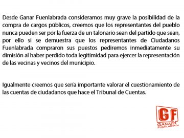 Desde Ganar Fuenlabrada consideramos muy grave la posibilidad de la compra de cargos públicos, creemos que los representantes del pueblo nunca pueden ser por la fuerza de un talonario sean del partido que sean, por ello si se demuestra que