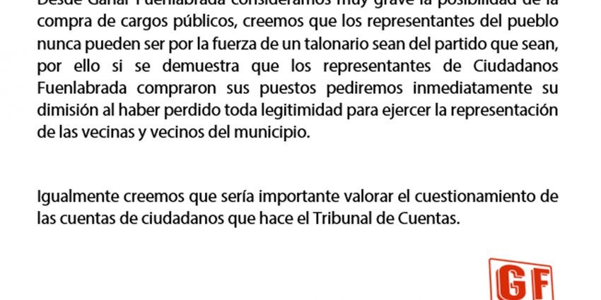 Desde Ganar Fuenlabrada consideramos muy grave la posibilidad de la compra de cargos públicos, creemos que los representantes del pueblo nunca pueden ser por la fuerza de un talonario sean del partido que sean, por ello si se demuestra que los representantes de Ciudadanos Fuenlabrada compraron sus puestos pediremos inmediatamente su dimisión al haber perdido toda legitimidad para ejercer la representación de las vecinas y vecinos del municipio.