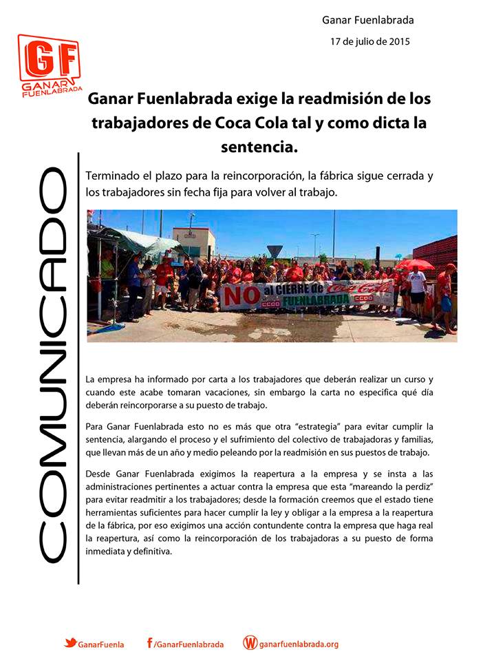 Desde Ganar Fuenlabrada exigimos la inmediata readmisión de las trabajadoras y trabajadores de Coca Cola.