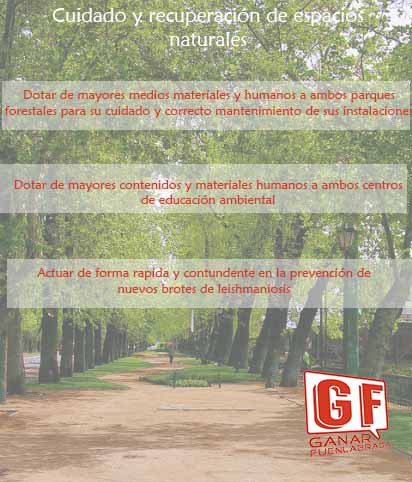 La primera moción versa sobre el cuidado y la recuperación de los espacios naturales de nuestra ciudad: Parque Polvoranca y Bosque Sur. En ella instamos a la Comunidad de Madrid a dotar de mayores medios materiales y humanos a ambos parques forestales para su cuidado y correcto mantenimiento de las instalaciones. Además, exigimos que sus centros de educación ambiental sean dotados de mayores medios materiales y humanos, con el fin de poder recuperar sus actividad previa a los recortes. Solicitamos así mismo la rápida y contundente en la prevención de nuevos brotes de Leishmaniosis en la zona.