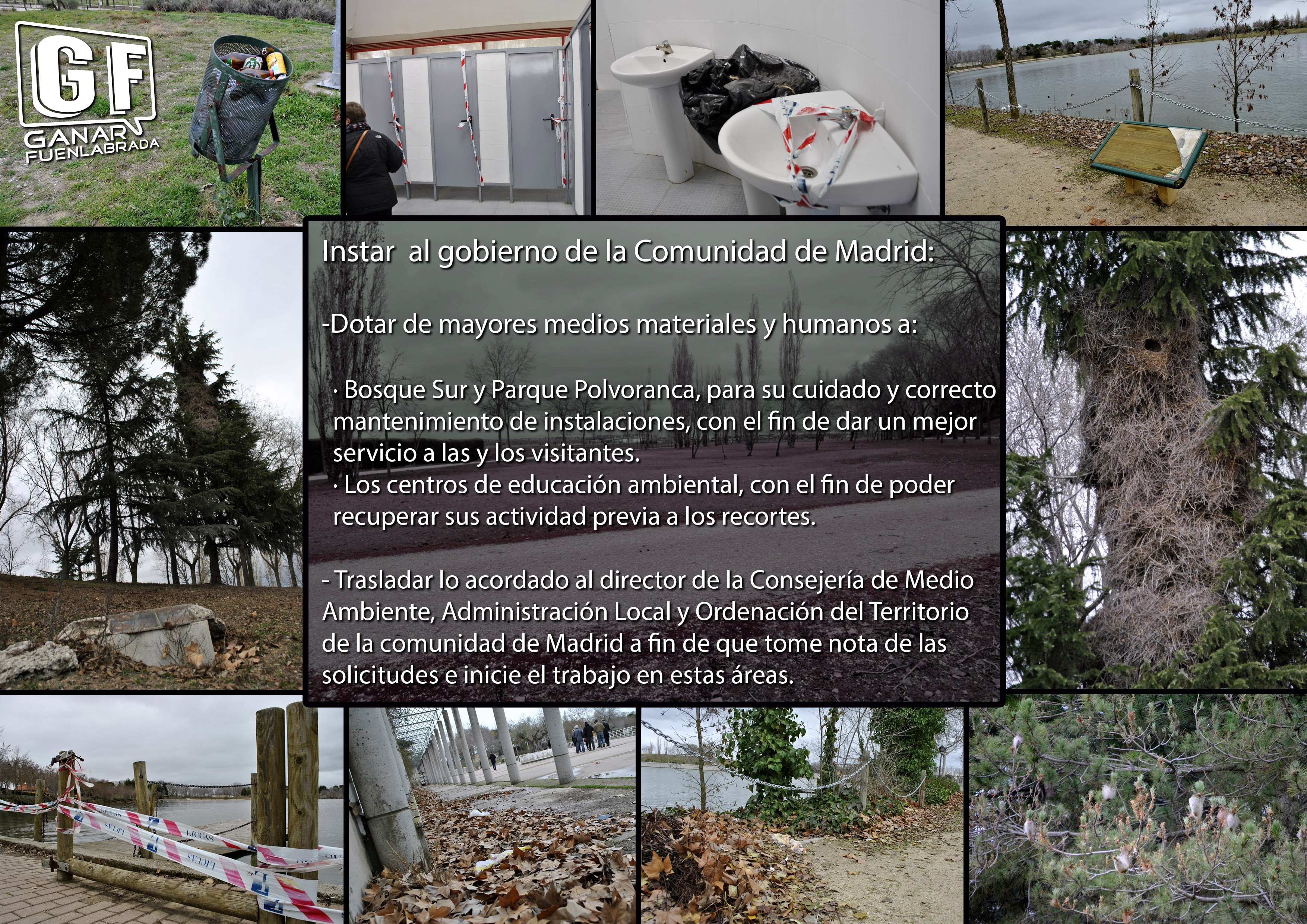En el mes de enero el grupo municipal de Ganar Fuenlabrada ya presentó una moción para instar a la comunidad de Madrid a cuidar ambos parques forestales de los que las vecinas de Fuenlabrada utiliza y a cuidar de su estado para que las vecinas puedan disfrutar del espacio sin sufrir las molestias que ocasiona el deterioro material y el abandono que sufren las instalaciones.
