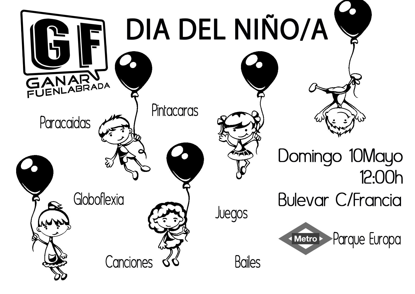 Este Domingo día 10 de mayo a las 12:00h estaremos en el bulevar de la C/Francia junto al metro Parque Europa, con actividades infantiles (juegos, pintacaras, globoflexia, etc.)