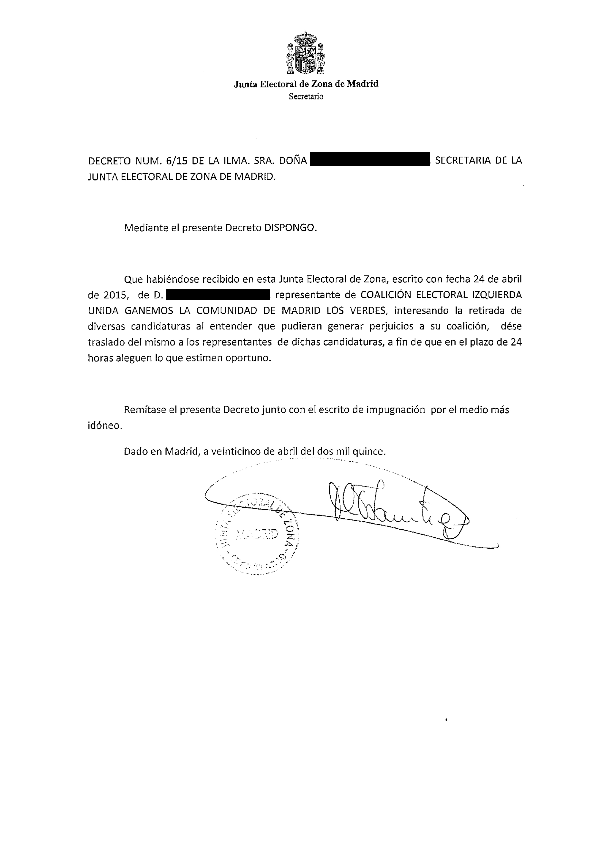 Izquierda Unida de la Comunidad de Madrid pide a la Junta Electoral la retirada e impugnación de las candidaturas Ganar Fuenlabrada, Ganar Alcorcón, Ganemos Pinto, Ganar Humanes y Leganemos.