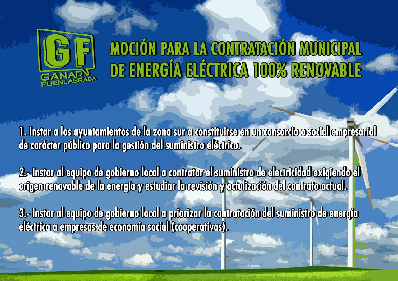 Desde Ganar Fuenlabrada nos informan que en junta de portavoces se ha alcanzado un acuerdo por el cual todos los grupos municipales apoyaran la moción que presenta la formación al próximo pleno y donde se propone crear un consorcio energético en la zona sur que gestione el consumo de electricidad de los municipios con energía de origen 100% renovable.